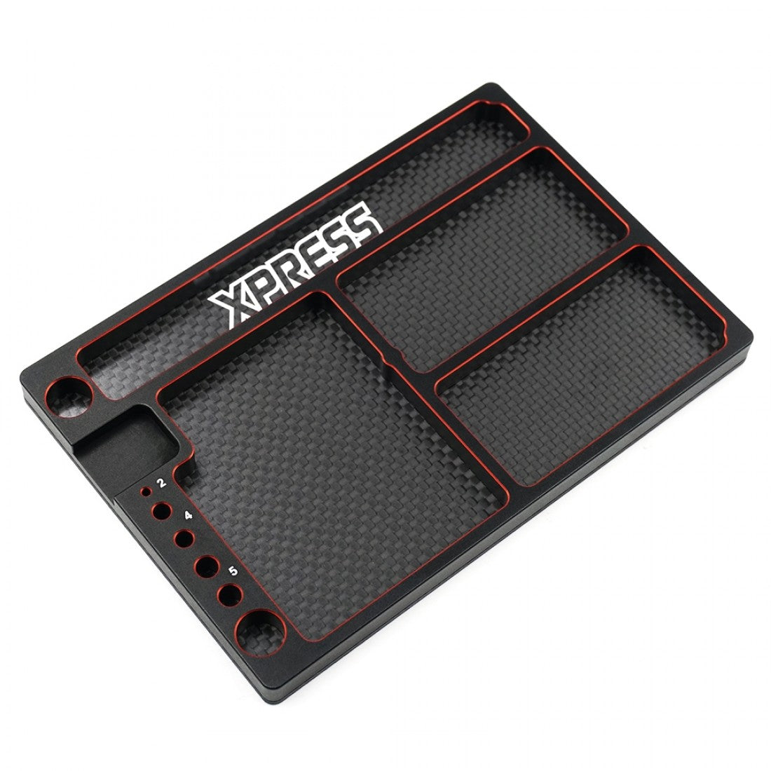 Plateau de pièces multifonctions Xpress, un outil précieux à conserver sur votre table de fosse. En plus d'organiser soigneusement les vis, ce plateau comporte des sections qui vous permettent de souder des fiches bananes et même de maintenir vos différentiels d'engrenages pour une reconstruction facile !